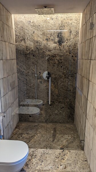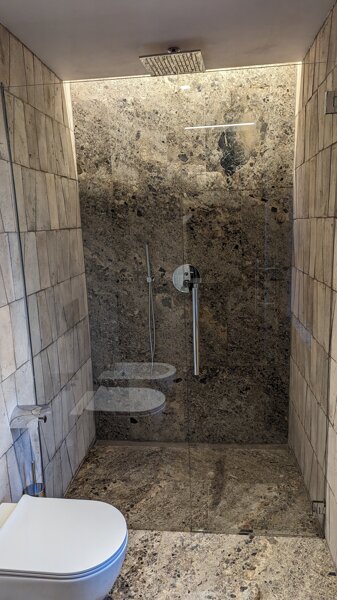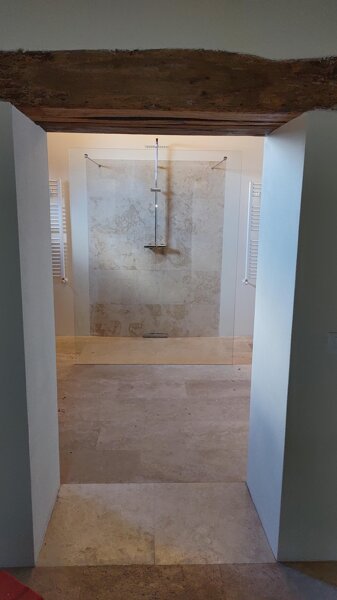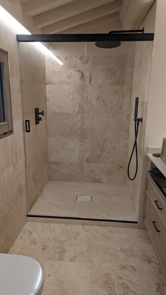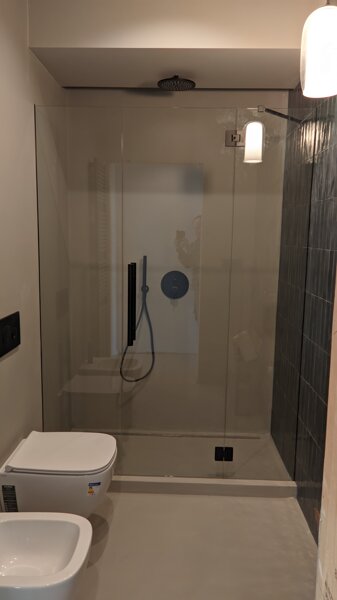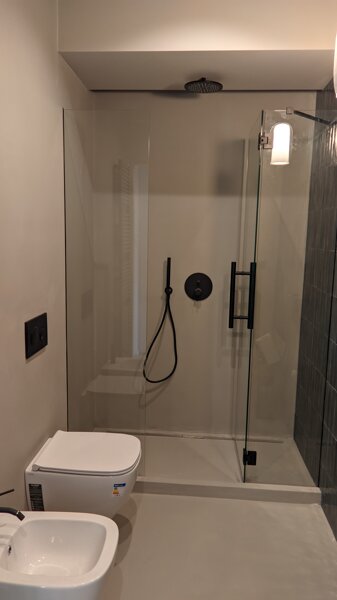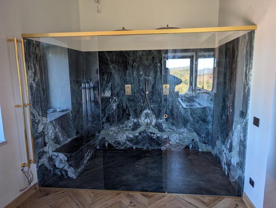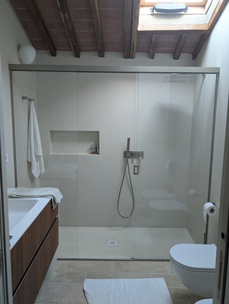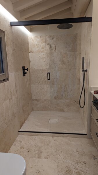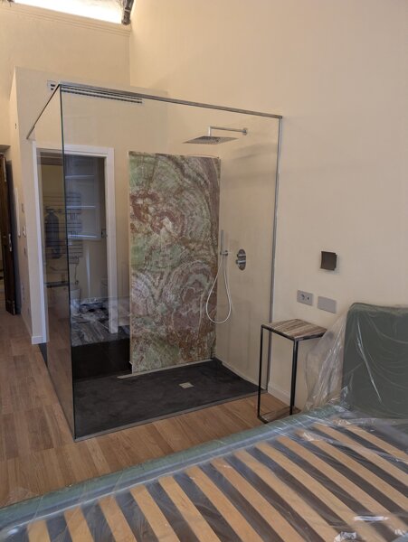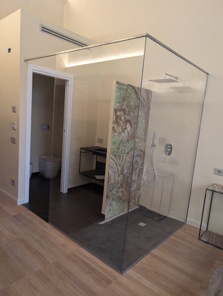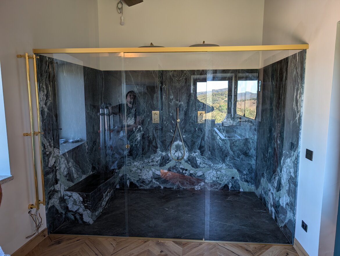 Stanza in vetro con doccia, composta da vetro 5+8 anticalcare temperato con profili in acciaio inox