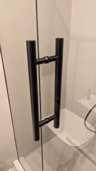 Parete doccia con porta scorrevole centrale, finitura oro opaco