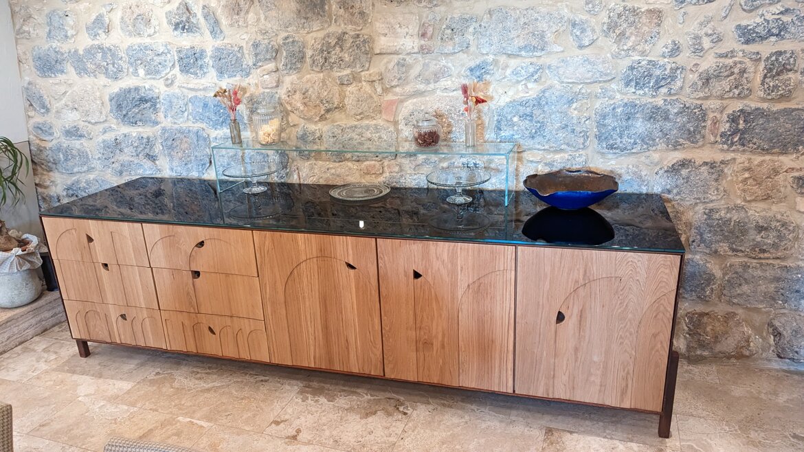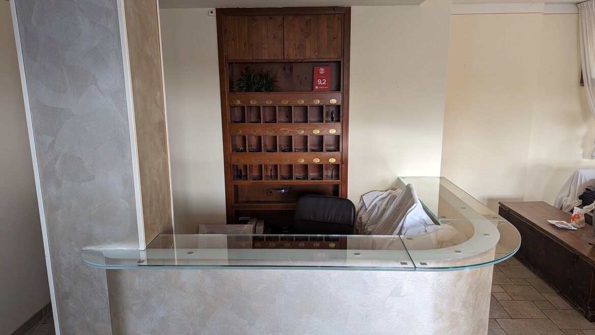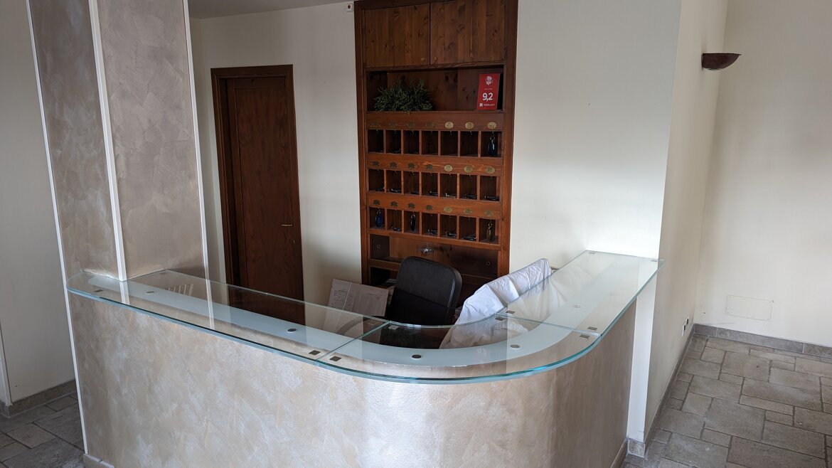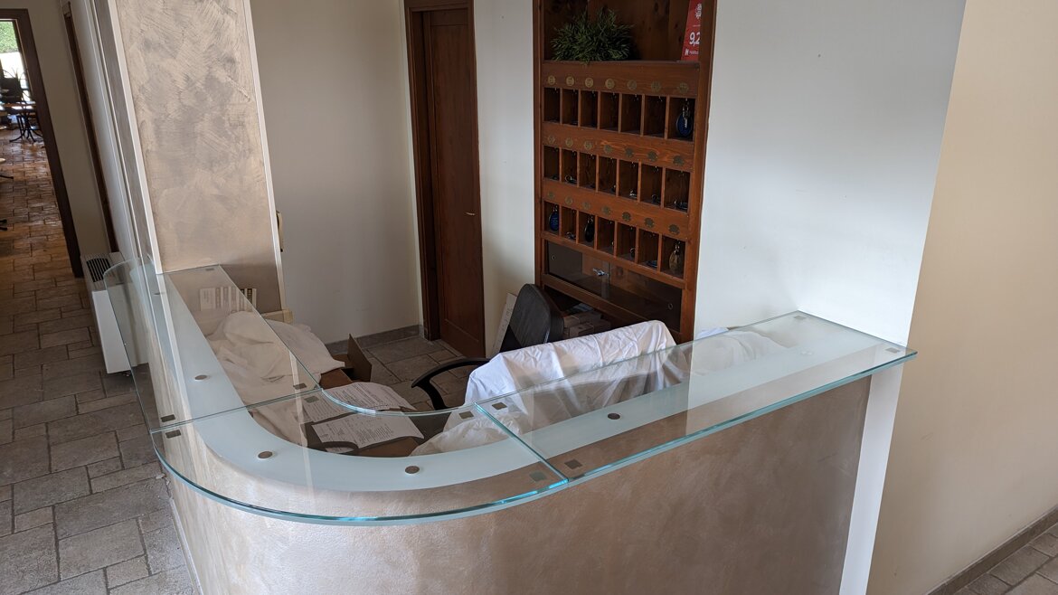 Bancone composto con float 12mm extrachiaro temperato a filo lucido con striscia verniciata bianca fermata con attacchi puntuali e float 8mm extrachiaro temperato a filo lucido con placche incollate