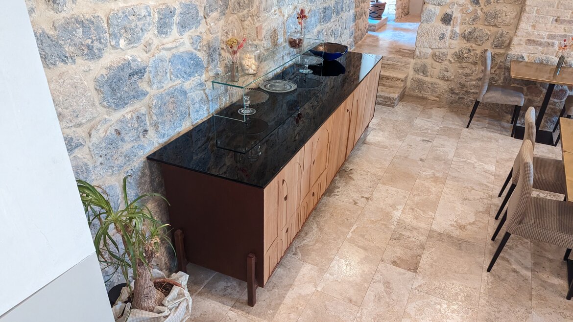 Piano in float 10mm temperato a filo lucido verniciato nero con espositore in float 8mm extrachiaro temperato a filo lucido incollato