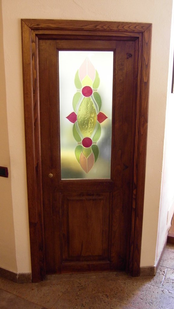 Le porte con telaio in legno, acciaio inox, ferro, possono essere completate con vetri artistici.