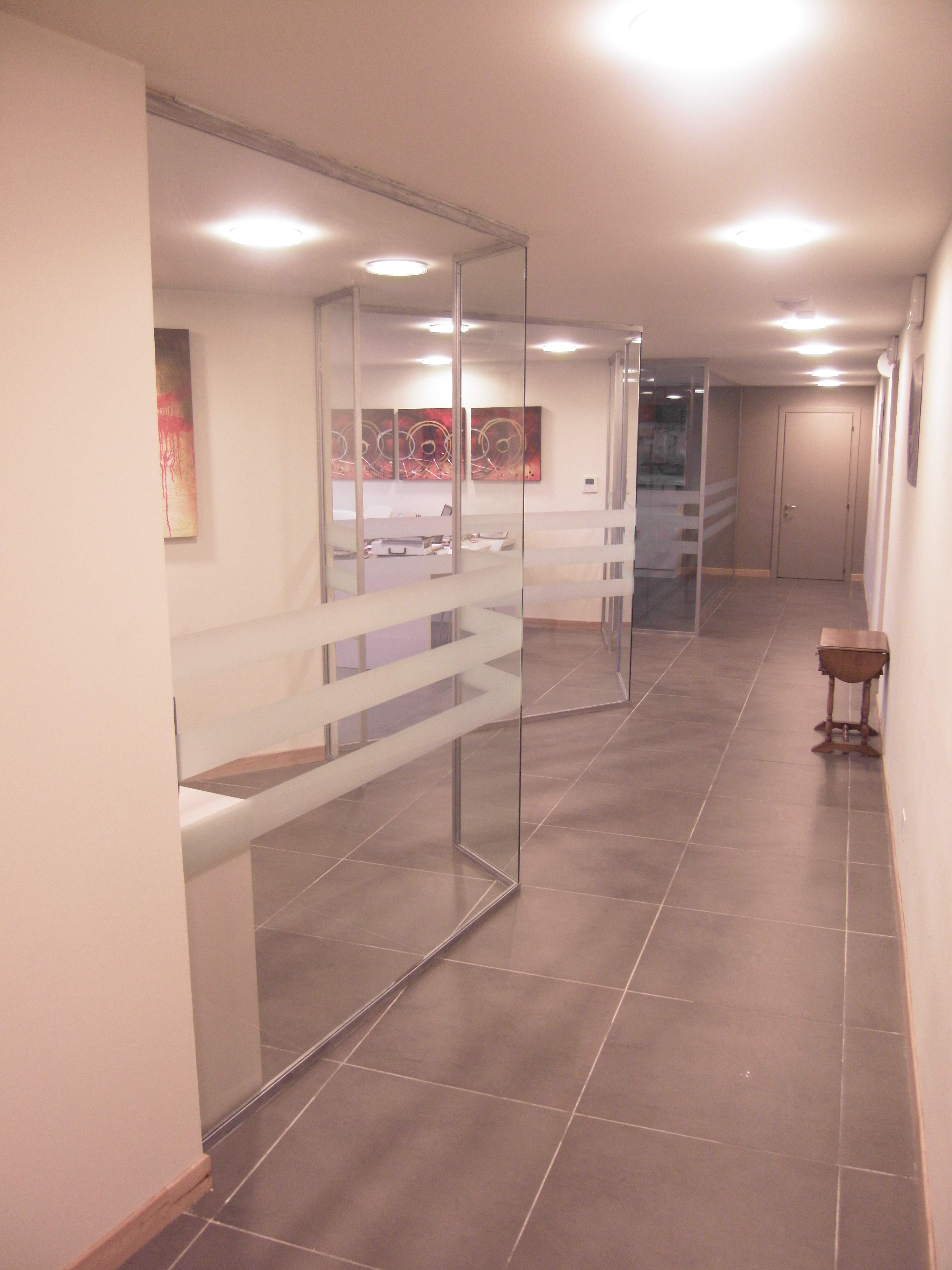 Parete in vetro 8+8 temperato a filo lucido con porta in float 10mm temperato a filo lucido con profili in alluminio satinato