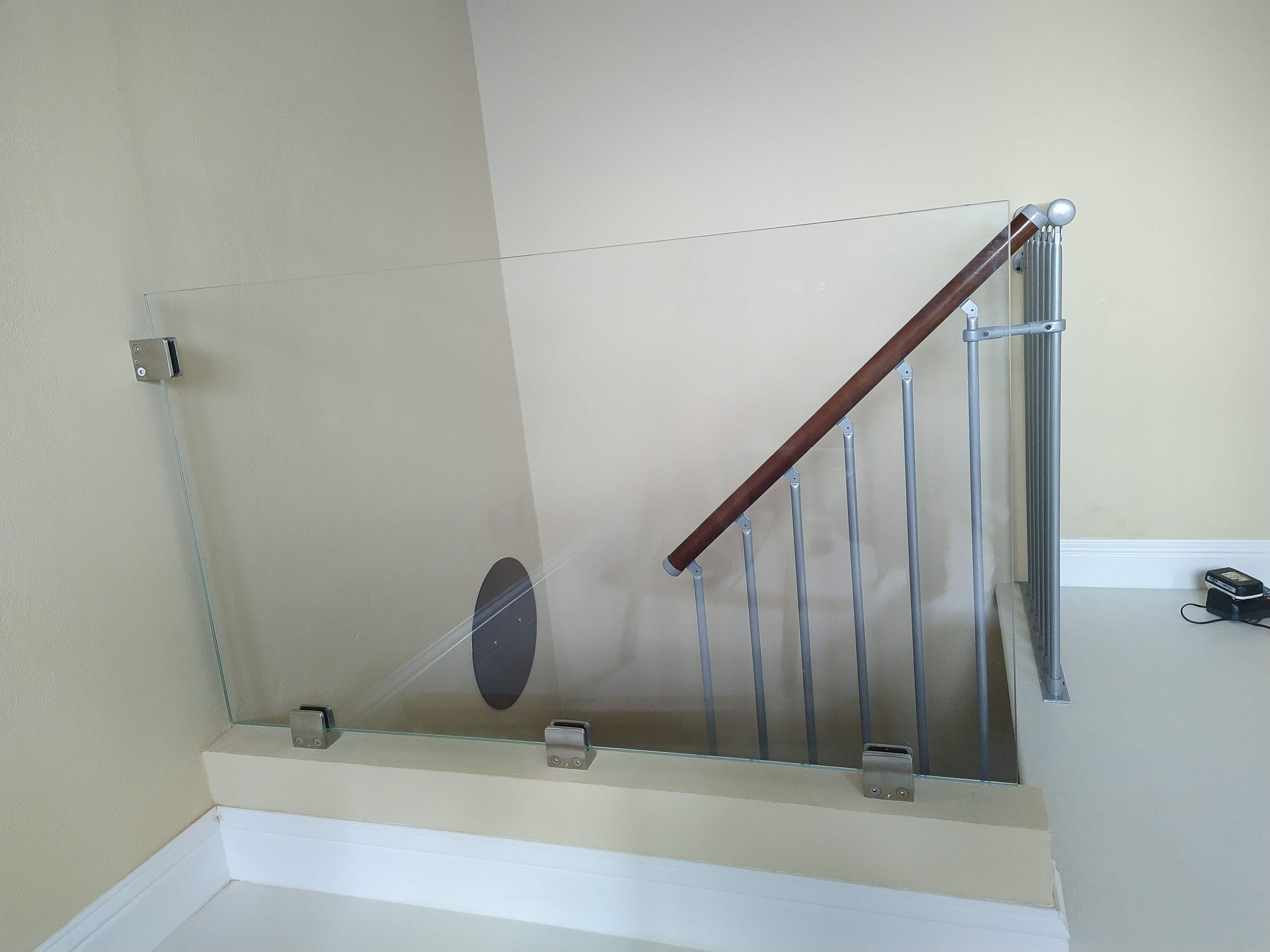 Parapetto in10+10 extrachiaro fissato sul montante della scala